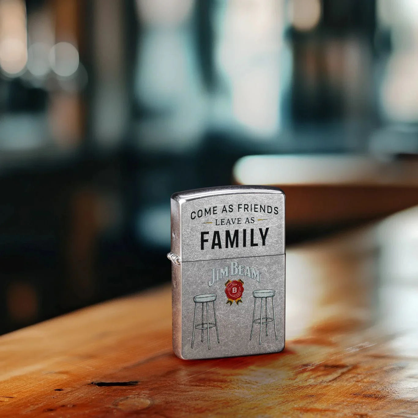 Denne Zippo-lighteren feirer den legendariske bourbon-produsenten Jim Beam® – kjent for kvalitet, samhold og ekte amerikansk håndverk. Motivet viser Jim Beam-logoen flankert av to barstoler med teksten «Come as friends, leave as family», et uttrykk som oppsummerer Jim Beams ånd perfekt. Designet er gjengitt i levende farger på en klassisk Street Chrome-overflate.