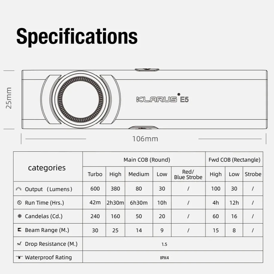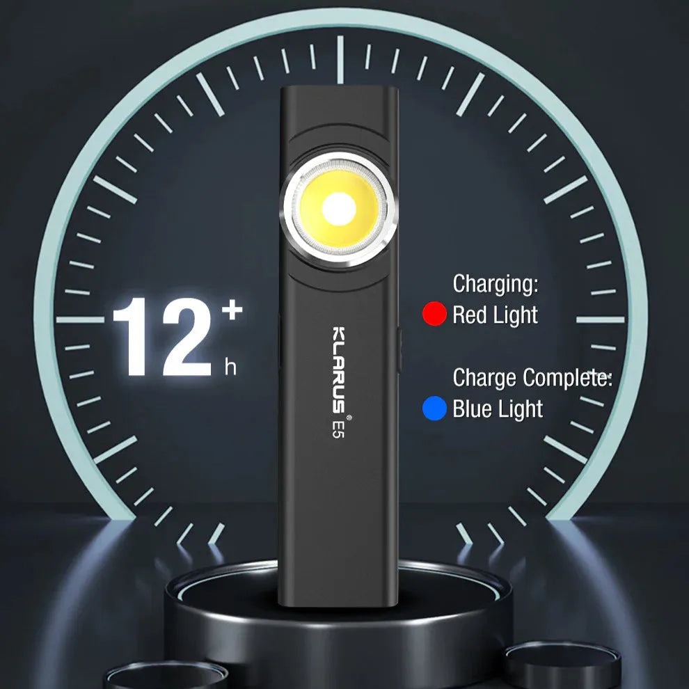 Features: Brightness: Up to 600 lumens for bright and clear light Battery Capacity: 450 mAh for extended use Maximum Operating Time: 12 hours of continuous use Compact and Lightweight: Only 37 g and 8 mm thick USB-C Charging: Fast charging for easy recharge Durable Construction: Upgraded integrated cylinder for extra strength Hands-Free Use: Magnetic base and pocket clip for flexible placement Waterproof: IPX4-rated, withstands rain and rough conditions KLARUS E5 offers you an ideal balance between power and portability, whether you need light on the go or a reliable light source for everyday use.