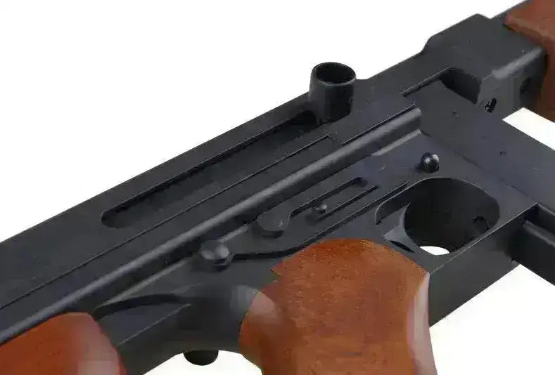 This iconic airsoft smg rifle is well known for its role in mafia movies and games. The Thomson M1A1 saw the light of day in 1917, towards the end of World War I. This rifle is made of steel, metal alloy and abs. The body, barrel and sights are made of metal - while the stock, forend and pistol grip are made of ABS plastic. good quality, with elaborate wood imitation. The sling mount and magazine cover get a lot of wear of the outer parts, which is why they are made of steel.
