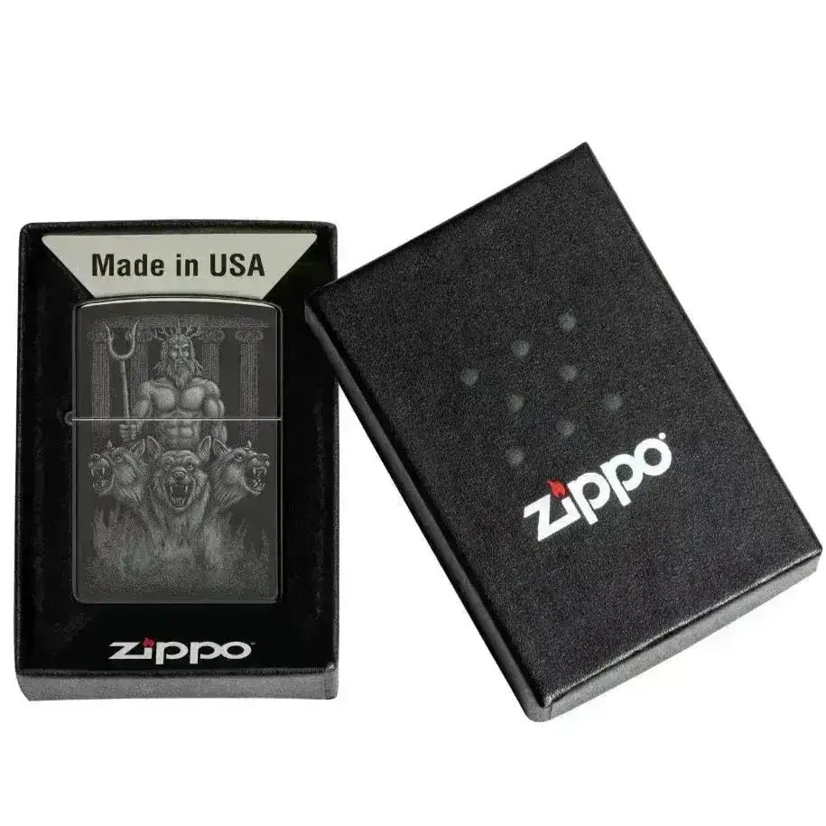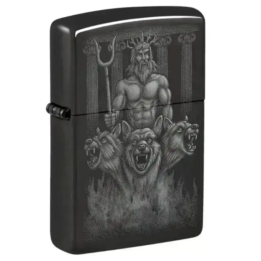 A stunning Zippo lighter in High Polish Black with an impressive design depicting a powerful god flanked by guarding dogs. This reliable and stylish lighter is both a functional and decorative item, ideal for everyday use or as a gift.