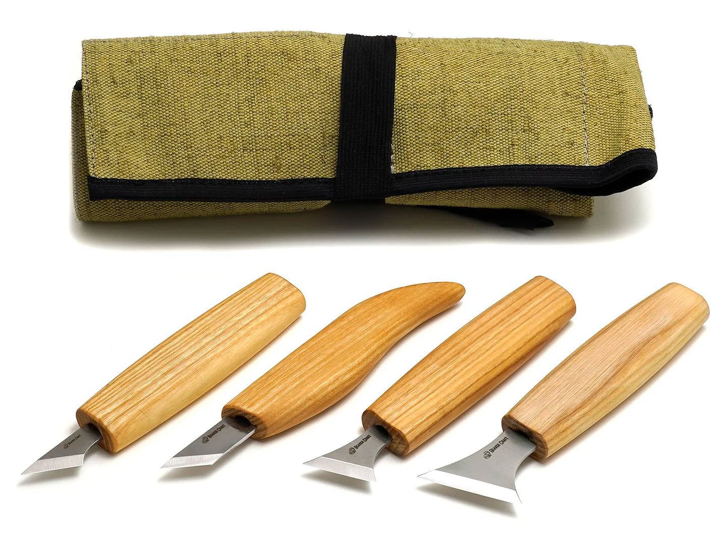 You get a canvas roll with 4 different irons, the blades made of carbon steel that stays sharp for a long time. These handmade Karveskurd irons is sharpened and ready right out of the box.