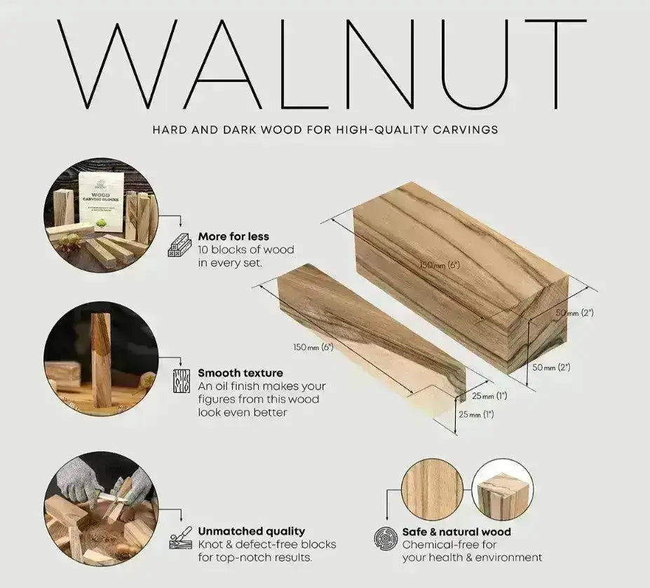 With beautiful grain and pattern and a medium hardness, Walnut is a good wood to work with. Create beautiful figures with unique patterns with Walnut. The wooden blocks are made of European Walnut.