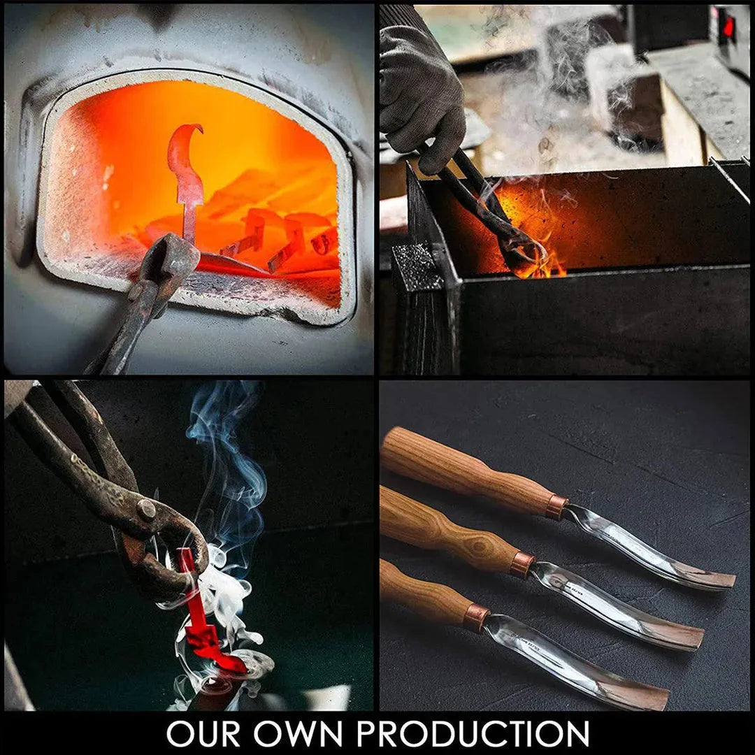 The gouge is made from high-quality carbon steel and is razor-sharp upon delivery. This tool is handmade and suited for both beginners and experienced woodcarvers who demand precision and durability.