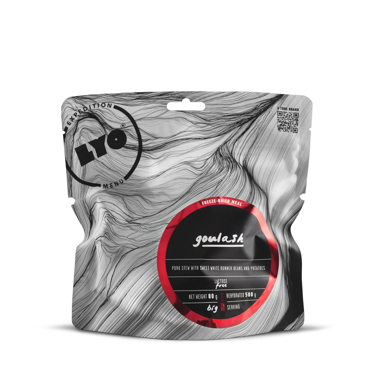 Hungarian comfort food for cold days and long hikesLYOFOOD Goulash is a warming and flavorful pork stew inspired by the Hungarian classic. The dish contains tender pieces of pork, white beans, and potato in a rich tomato-based sauce along with carrot, bell pepper, and parsley root. With 100% natural ingredients and a long shelf life, this is the perfect dinner for mountain hikes, hunting, or expeditions – regardless of the weather and season.
