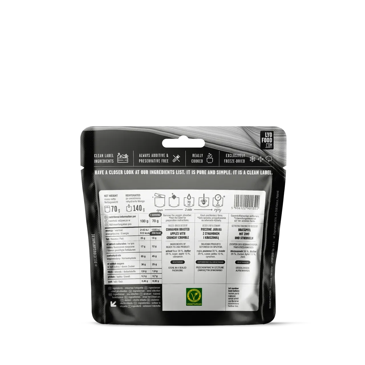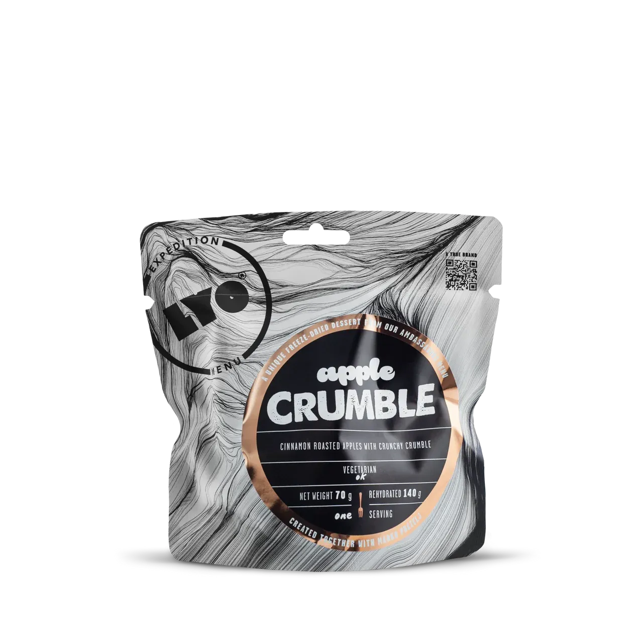 Marko Prezelj's favorite dessert! This freeze-dried apple dessert is made with cinnamon-baked apples and a crispy crumble top – inspired by homemade apple pie. Perfect when you want something sweet and satisfying after a meal, even in the mountains. Use less water for extra crispiness. Part of LYOFOOD's award-winning expedition series.Benefits