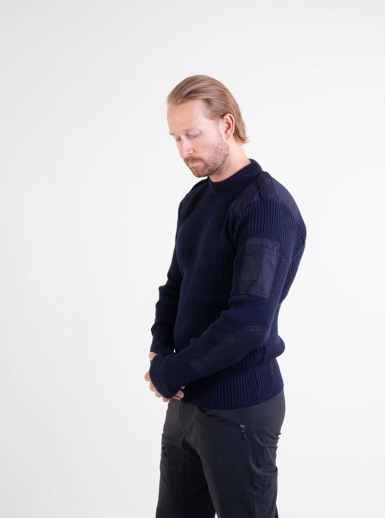 Bråtens' navy blue NATO sweater is inspired by the classics of the Norwegian military. With 80% wool and 20% polyester, it provides warmth, durability and high comfort. The shoulders and elbows are reinforced - it works just as well in the field as in everyday use.