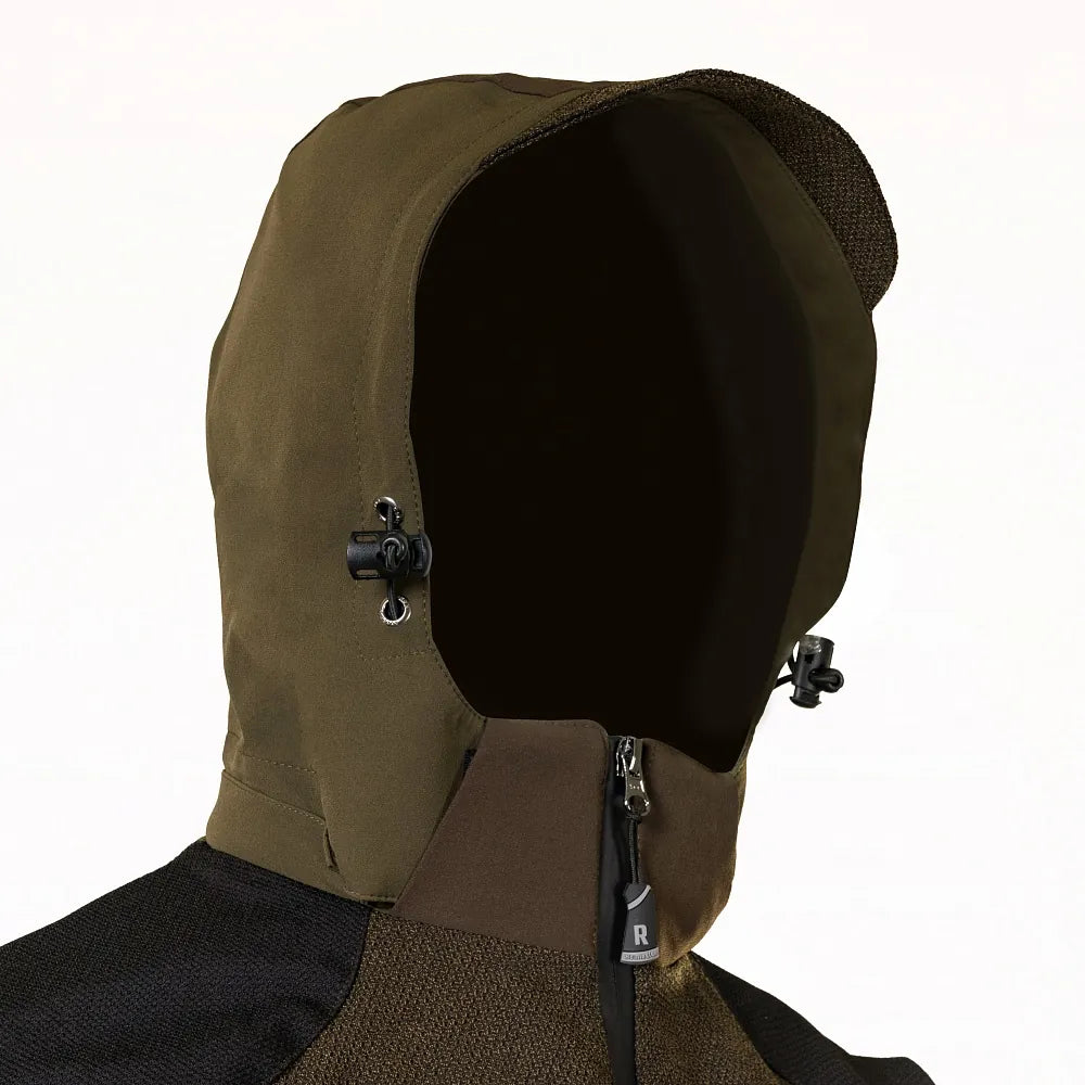 Hette med snøring skjermer mot nedbør og vind, og kan tas av når du ønsker lavere krage eller bruker caps og hørselvern. Materialet har lett elastisitet som gir god bevegelsesfrihet under gange og arbeid ute.