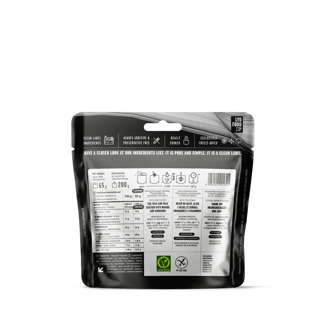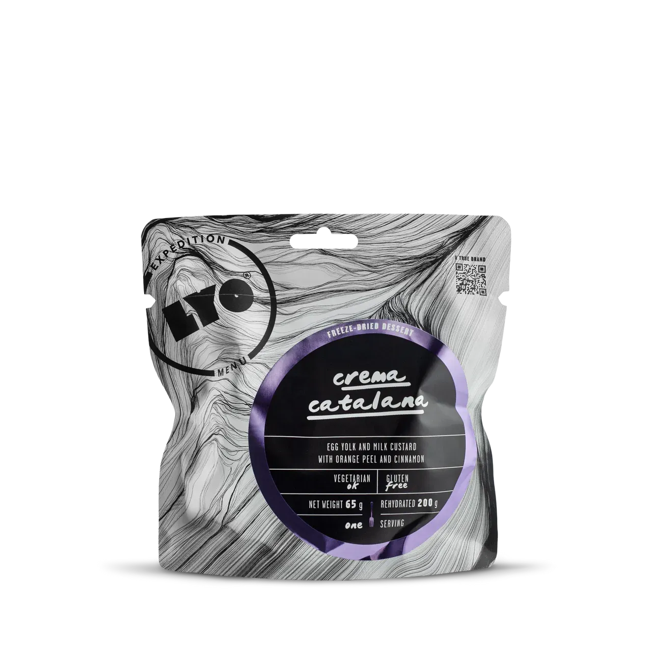 This classic Catalan dessert brings the taste of sunny Barcelona to even the coldest and most demanding expeditions. LYOFOOD Crema Catalana is made with milk, egg yolk, orange peel, and a hint of cinnamon – without artificial additives. Perfect as a dessert or sweet breakfast in the great outdoors. Ready in 3 minutes.