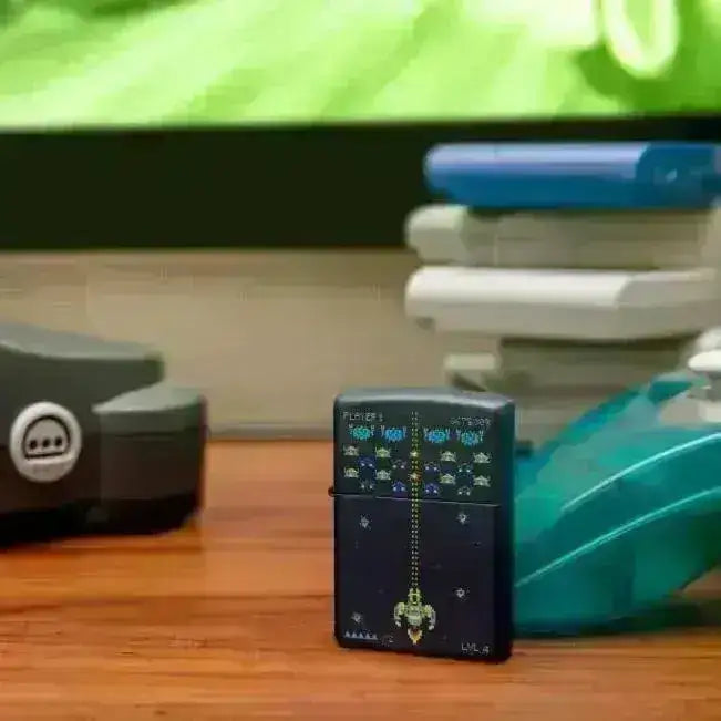 Retro gaming Zippo for gamers and everyone who loves retro stuff - Matte navy background with pixel game print