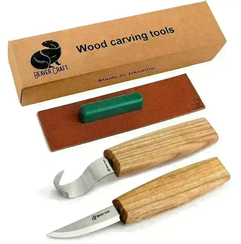 Håndlavede knive fra Ukraine. S01-sættet er perfekt til dem, der ønsker godt træskæringsudstyr, der giver dig mulighed for at forme og udhule træ både præcist og effektivt. Den buede kniv i dette udskæringssæt fra er perfekt til at udhule skeer, skåle og lignende, den medfølgende udskæringskniv har et kort og præcist blad og kan bruges til det meste træudskæringsarbejde.