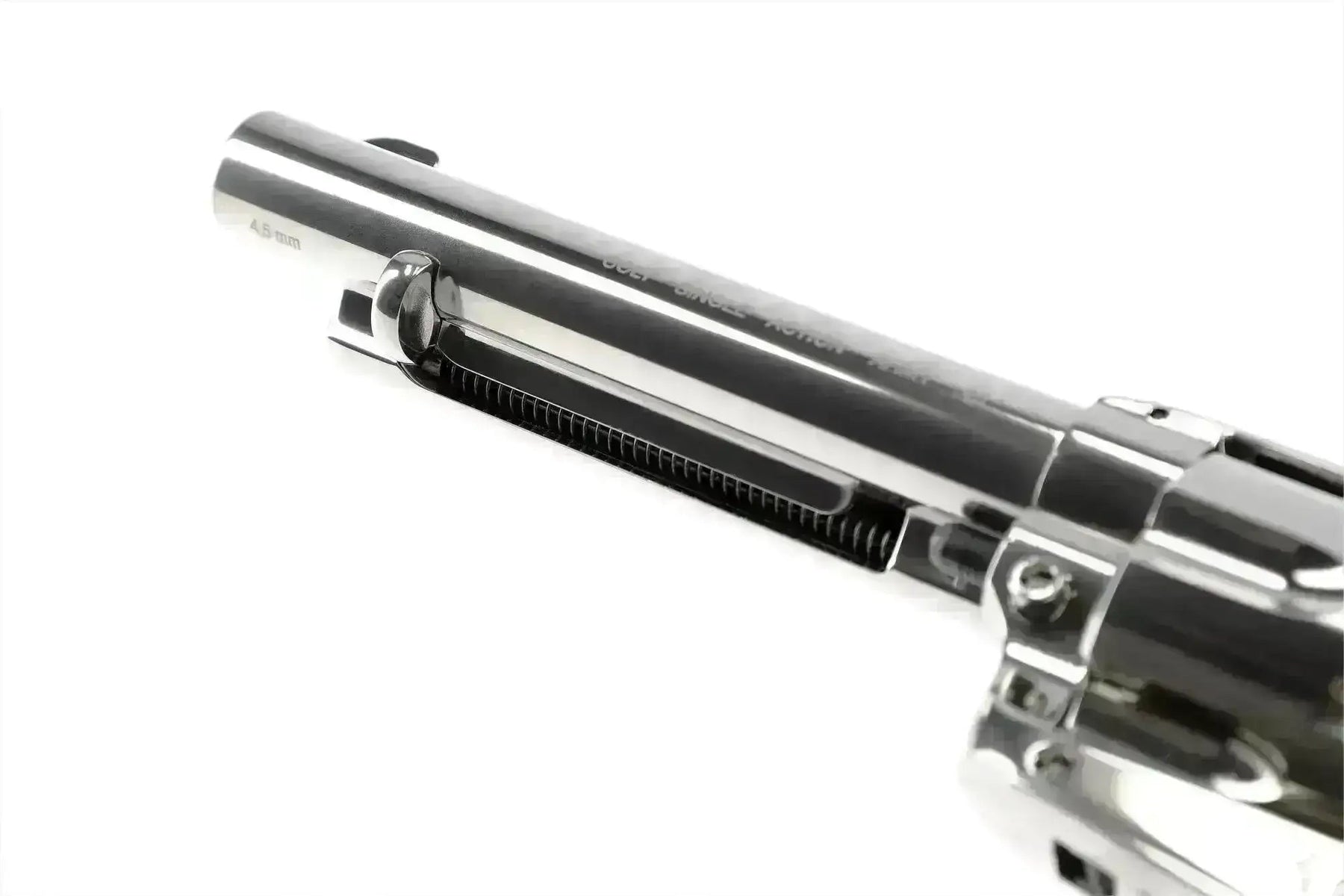 4,5 mm Pellets-versionen af denne klassiker er virkelig en fryd for øjnene, og revolveren har samme udseende, følelse og funktionalitet som den originale .45 Colt Peacemaker. Ligesom den rigtige revolver, forlænges løbet på denne ikke. Hver patron ilægges individuelt i ilægningshullet på højre side af cylinderen. Træk hammeren halvt bagud, drej derefter løbet og isæt en ny ladt patron. For at fjerne en tom patron skal du gøre præcis det samme i omvendt rækkefølge og trykke på udløserhåndtaget. For at lade patronerne med hagl, indsætter du en kugle i bunden af magasinet, hvilket betyder, at du ikke behøver at fjerne patronerne for at lade dem med kugler. Haglversionen, som du får her, leveres med riflet løb for ekstra præcision!