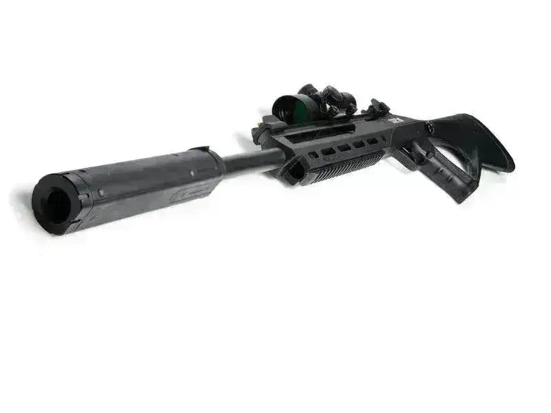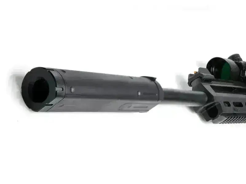 Gør din TAC-riffel komplet med denne specialdesignede lyddæmper. Takket være et vandret, fladt snit på undersiden af lyddæmperen, vil du kunne bruge TAC-laseren uden at lyddæmperen kommer i konflikt med laserstrålen! Lyddæmperen er nem at installere og får riflen til at se meget sejere ud end uden! Passer godt til både 6 mm og 4,5 mm versionerne!