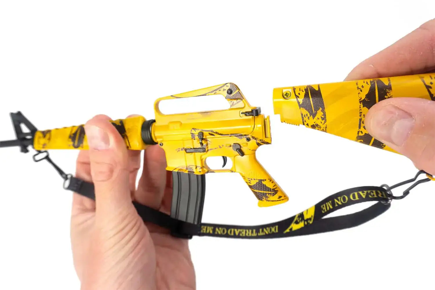 Oplev den legendariske M16A1 i en kompakt og kraftfuld specialudgave! Denne specialmodel "Don't Tread on Me" kombinerer klassisk amerikansk ikonografi med solid metal konstruktion. Perfekt for samlere, entusiaster og som gave til våbeninteresserede.