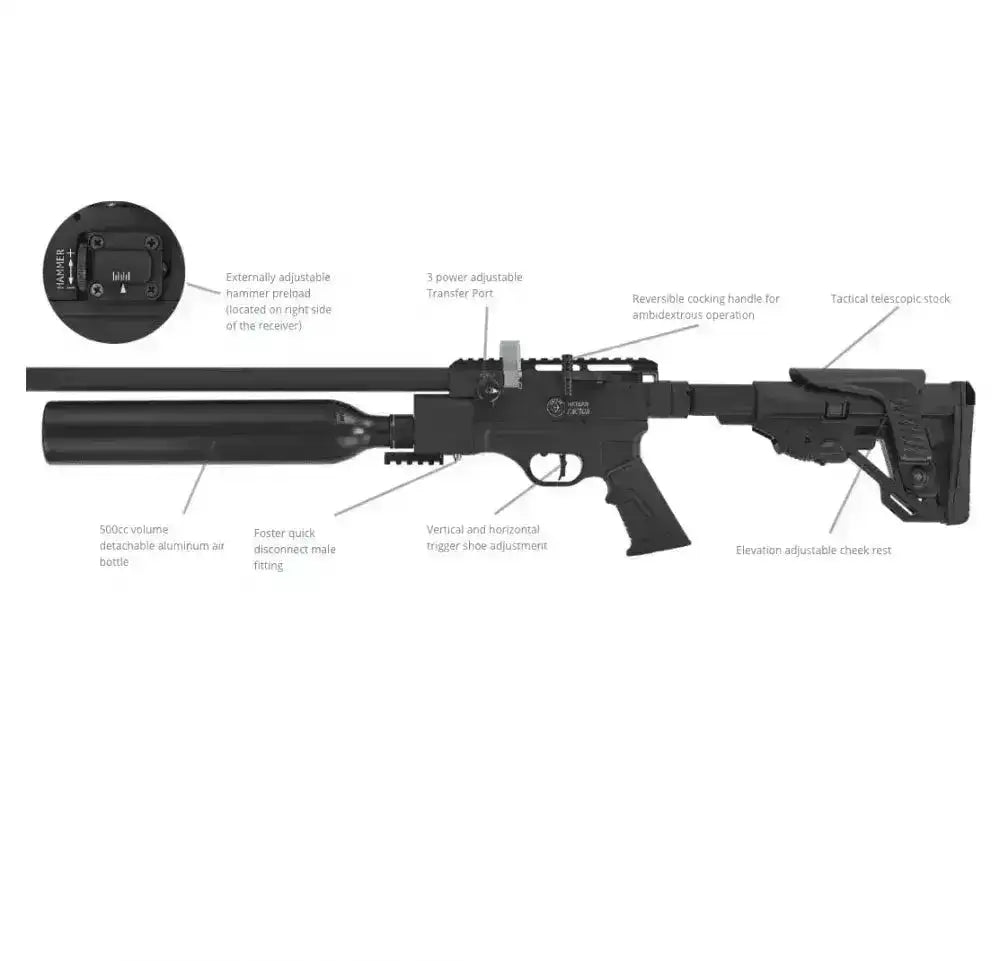 Både hammer og transfer port kan indstilles, så du kan ændre udgangshastighed. Dette gør det muligt at tilpasse riflen efter ammunition og afstand, så du kan lande meget præcise skud. Aftrækkeren er en quattro 2-trins justerbar trigger, aftrækkeren kan også justeres i højde og vinkel.
