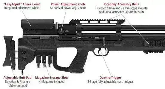 Bullpup betyder, at magasinet er placeret bag aftrækkeren, hvilket giver en lang løbslængde i en kort riffel. 21 mm skinner på undersiden og siderne af forenden giver dig mulighed for at fastgøre greb, toben eller lasere, hvis det ønskes. Riflen har en sikkerhedsmekanisme, der forhindrer dobbeltopladning efter en fuld opladning.