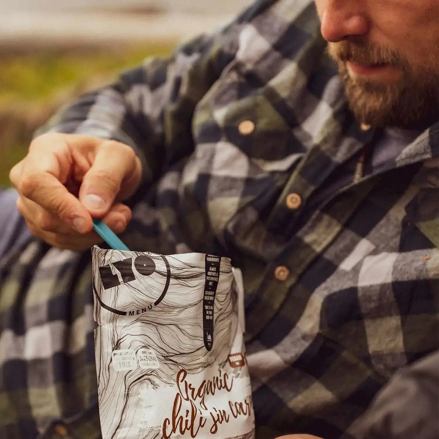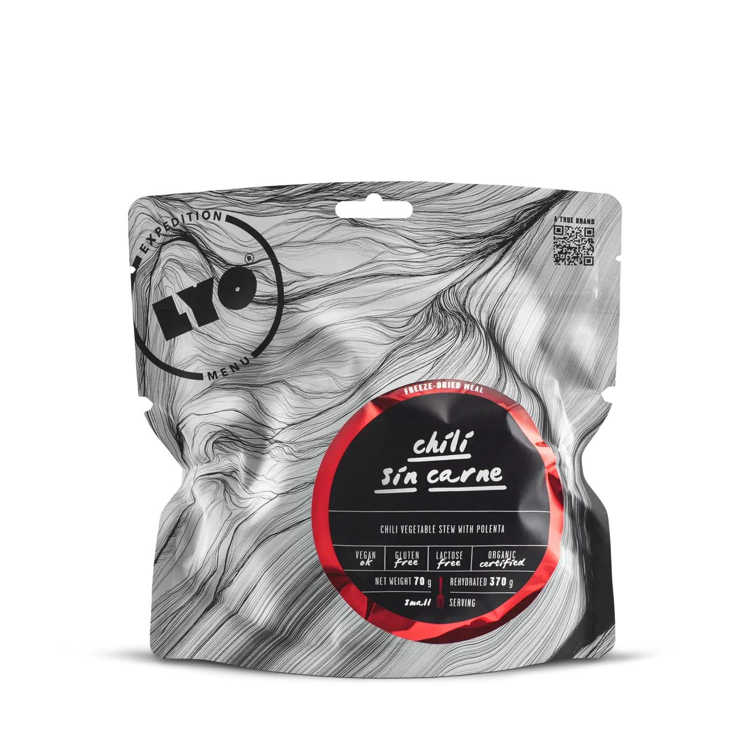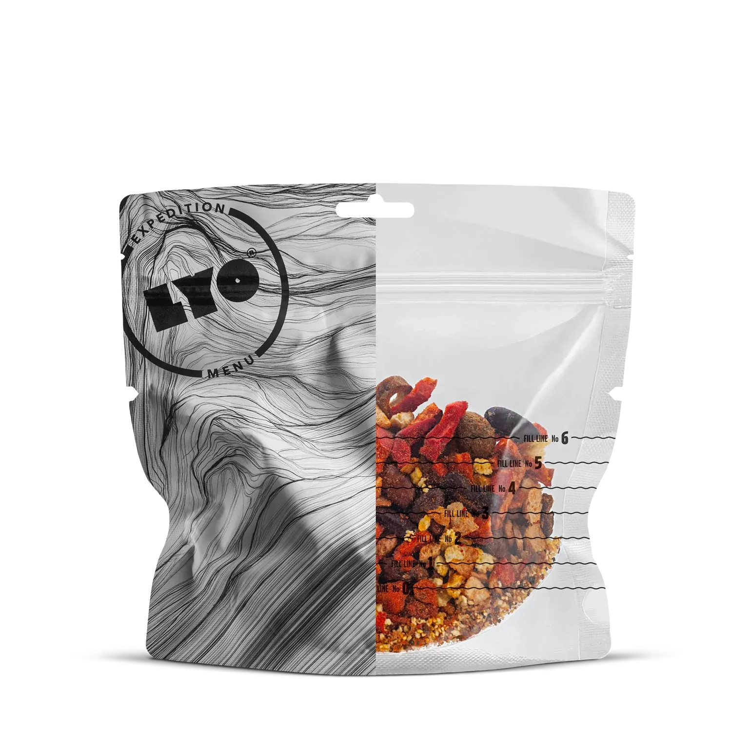 LYOFOOD Chili sin carne leverer autentisk mexicansk smag med bønner, ris, peberfrugter og majs i en krydret tomatsauce. En perfekt frysetørret middag for eventyrere, der ønsker et vegetarisk alternativ med masser af energi. 100% naturlige ingredienser, ingen konserveringsmidler, let vægt og lang holdbarhed.