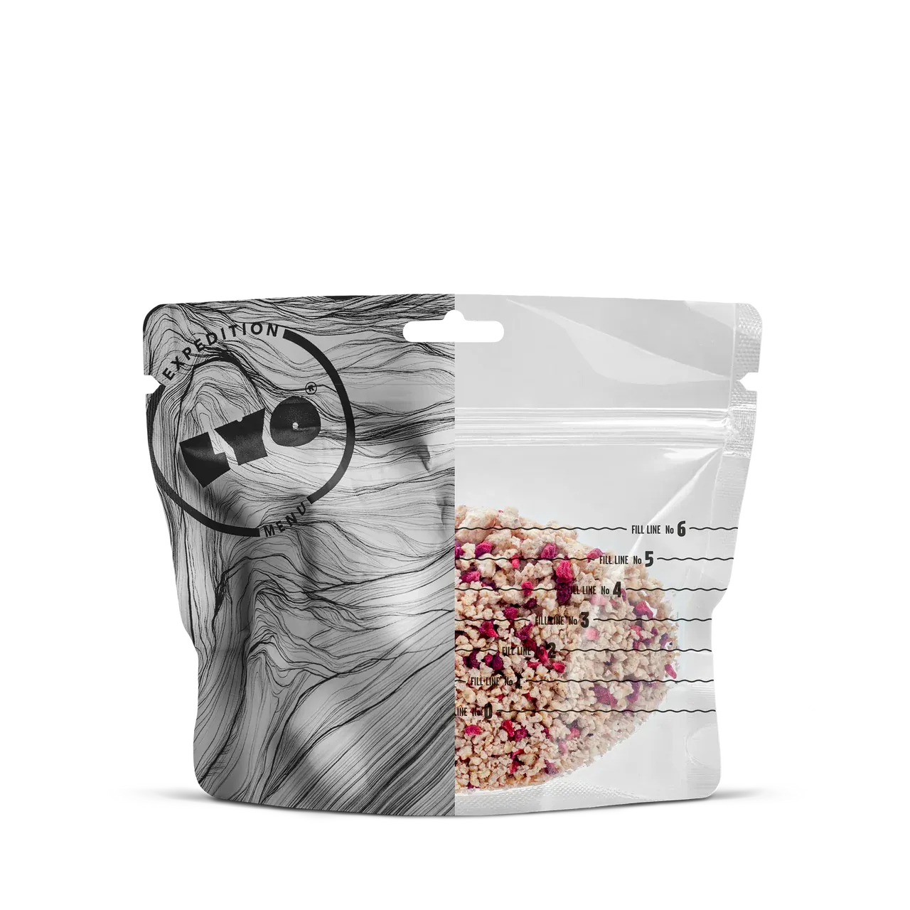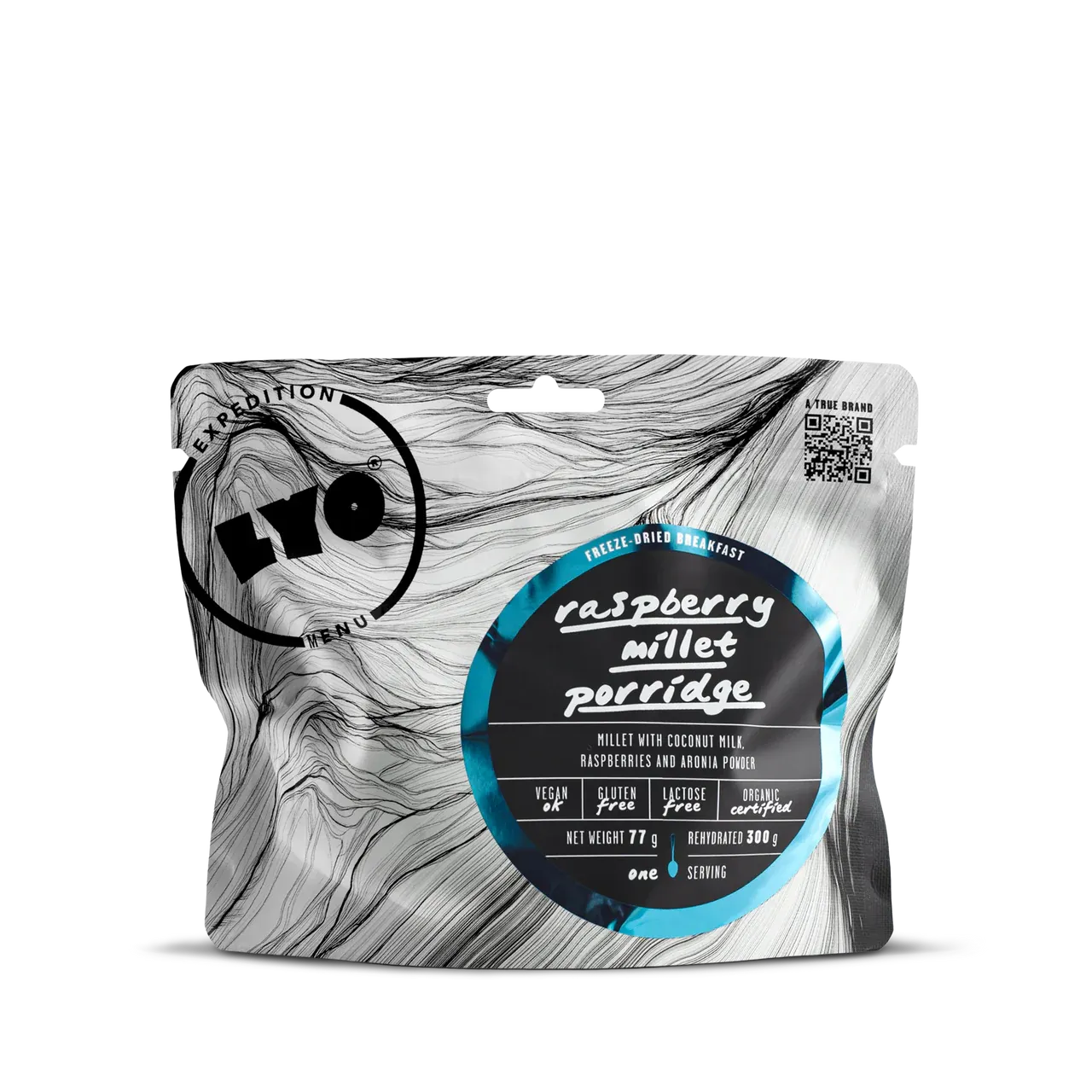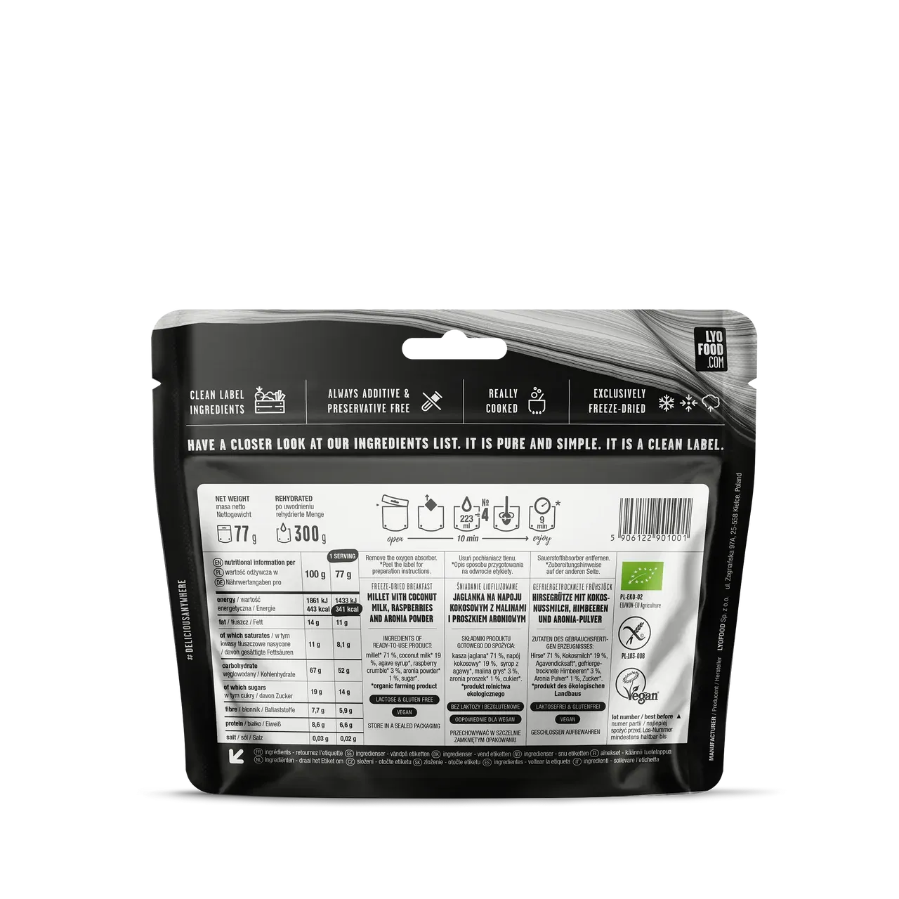 En lækker morgenmadsgrød med økologisk hirse, kokosmælk, hindbær og aronia. Sødet med agavesirup og helt fri for tilsætningsstoffer. Denne morgenmad fra LYOFOOD giver et nærende og naturligt boost – perfekt til ture, ekspeditioner eller travle hverdage. Glutenfri, vegansk og laktosefri.