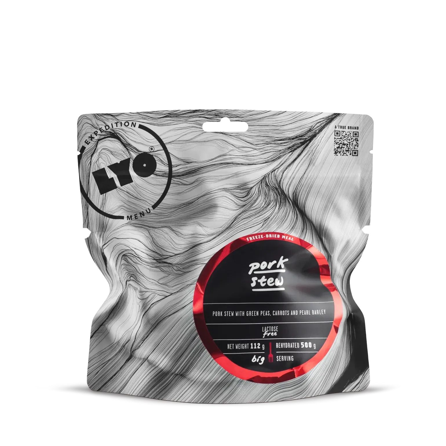 LYOFOOD svinegryde tilbyder ægte håndlavet smag med møre svinekødsstykker, grøntsager og en fyldig krydret sauce. Perfekt til lange dage i bjergene, på jagt eller på ekspedition. Retten er lavet med 100% naturlige ingredienser, ingen konserveringsmidler, frysetørret for lav vægt og lang holdbarhed.