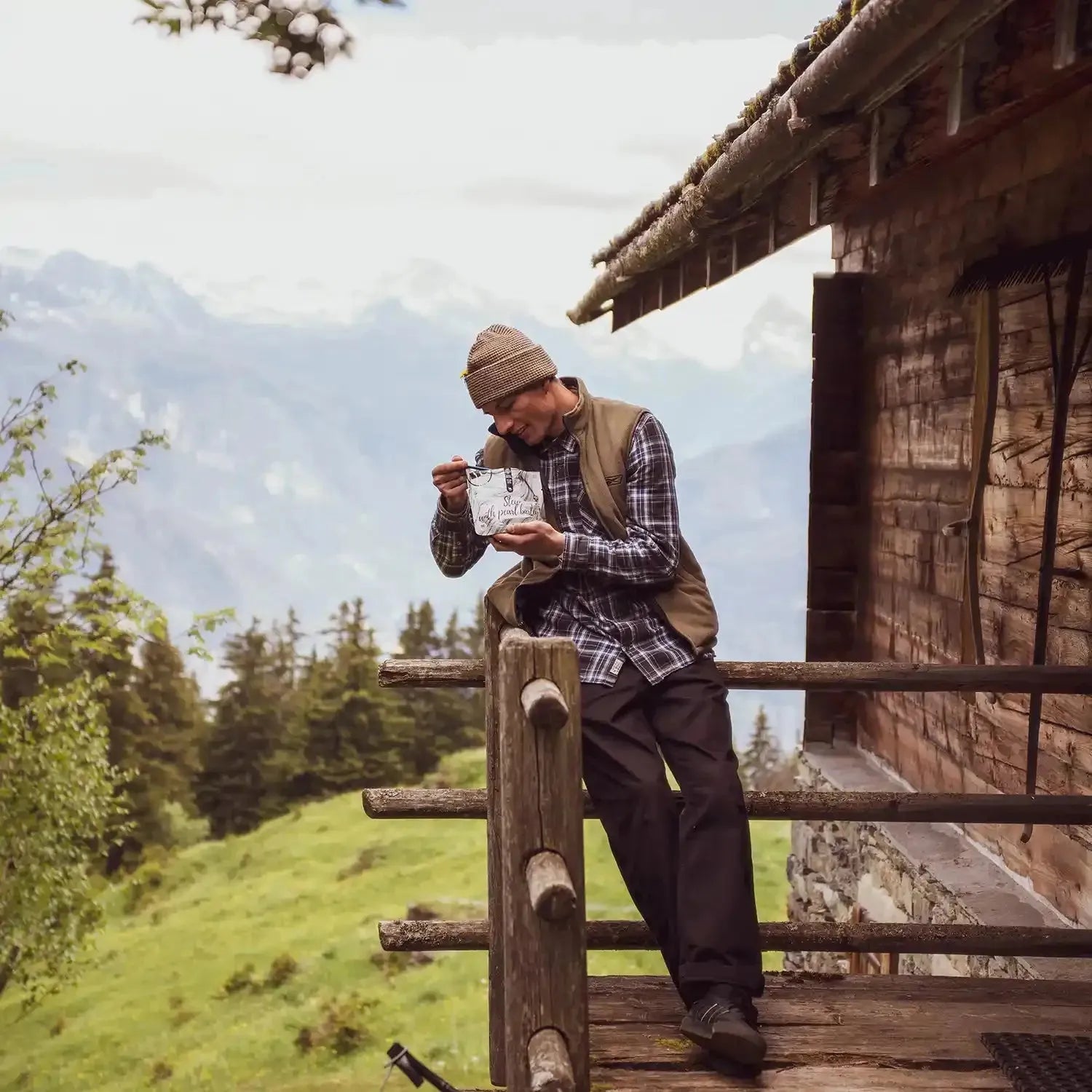 Tilsæt kogende vand direkte til posen, rør grundigt og vent i 8-10 minutter. Nyd en solid og mættende middag, uanset hvor dit eventyr fører dig hen.
