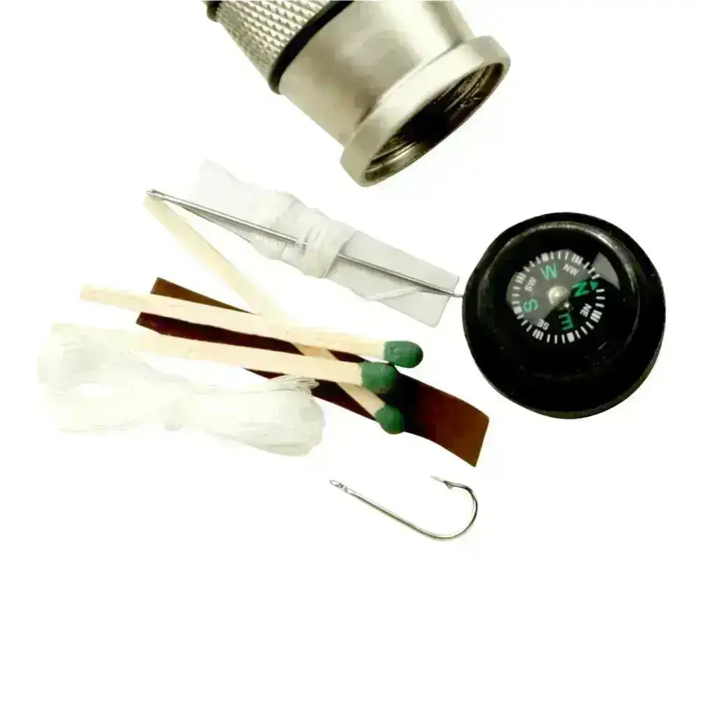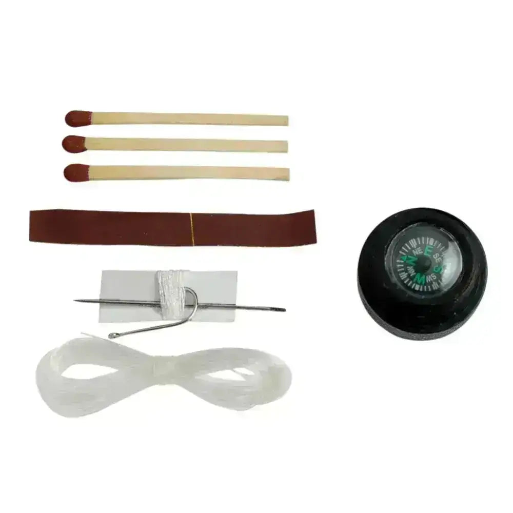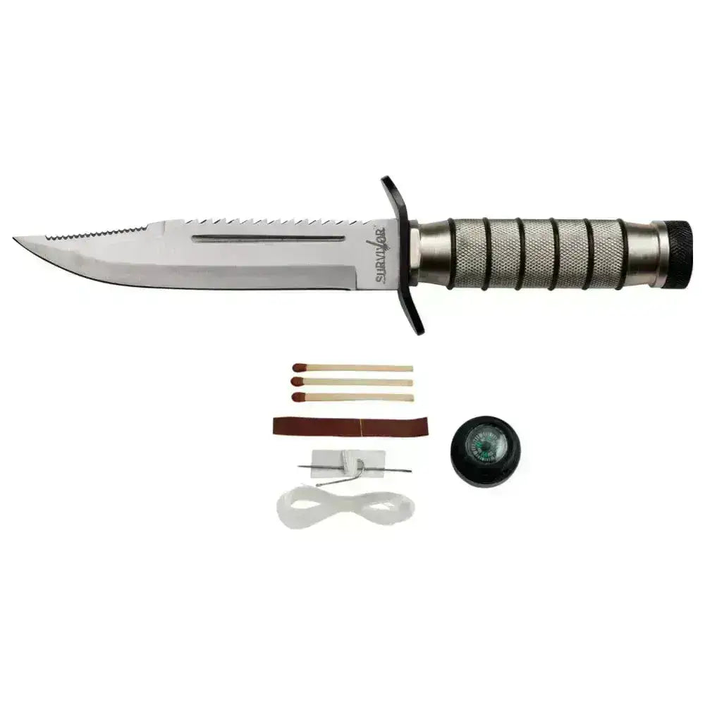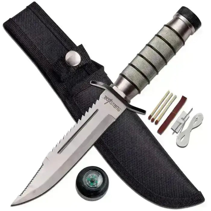 Det medfølgende overlevelseskit giver ekstra sikkerhed i naturen. Kniven opbevares sikkert i en sort nylonskede, der giver nem adgang og beskytter både brugeren og bladet.