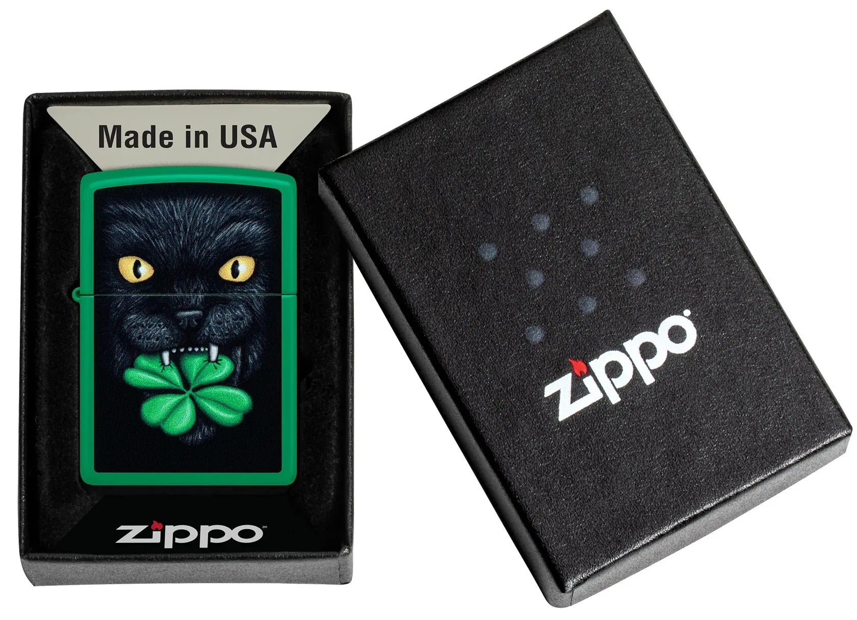 Tilføj et strejf af held i hverdagen med Zippo Feline Lucky Design. Denne klassiske Zippo-lighter har en livlig grøn mat finish og et farverigt motiv af en sort kat, der holder en firkløver i munden – et symbol på held og beskyttelse mod uheld.